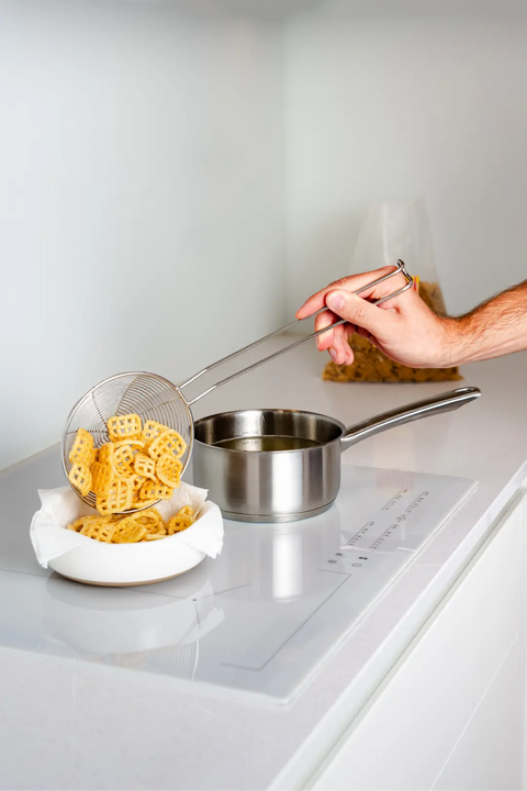 Unsere Empfehlung: Nutzen Sie unsere spezielle Cracker-Frittierkelle, damit überschüssiges Öl direkt abtropfen kann.